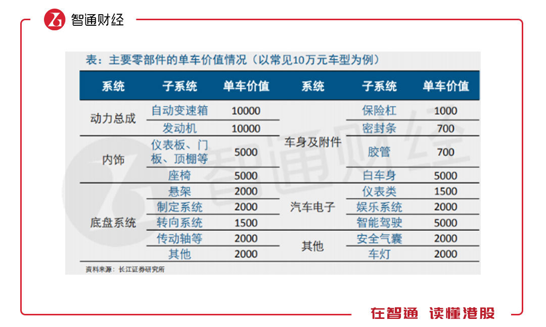 先看燃油車,按照長(zhǎng)江證券的研究,以10萬(wàn)元車型為例,各系統(tǒng)價(jià)值合計(jì)5.58萬(wàn)元,動(dòng)力總成占了35.8%,內(nèi)飾及汽車電子占33%,底盤(pán)占17%,車身及附件占13.3%。