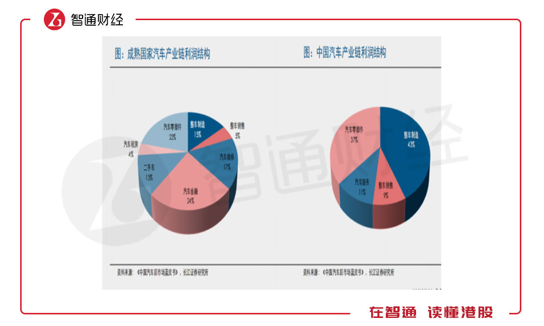 在港股上市公司中,汽車經(jīng)銷商主要銷售的均為進(jìn)口豪華車型,比如奧迪、奔馳及寶馬車型,主要還是國(guó)內(nèi)的自主品牌制造商有自己專門(mén)的銷售渠道。整體來(lái)看,銷售環(huán)節(jié)利潤(rùn)率一般都不高,凈利率賺個(gè)售價(jià)的3-5個(gè)百分點(diǎn)左右。汽車后市場(chǎng)龐大,但目前市場(chǎng)較為零散,還未形成較大規(guī)模的企業(yè)。