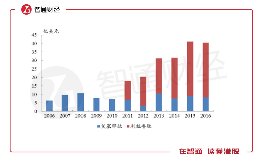 從2005年發(fā)展至今,全球已有6種GLP-1受體激動(dòng)劑相繼獲批上市,整個(gè)GLP-1受體激動(dòng)劑類(lèi)藥物的全球市場(chǎng)規(guī)模已超過(guò)40億美元,2011-2016年的復(fù)合增長(zhǎng)率超過(guò)15%。而艾塞那肽作為最早上市的GLP-1類(lèi)似物,上市后銷(xiāo)售額快速增長(zhǎng),早在2008年就突破10億美元。
