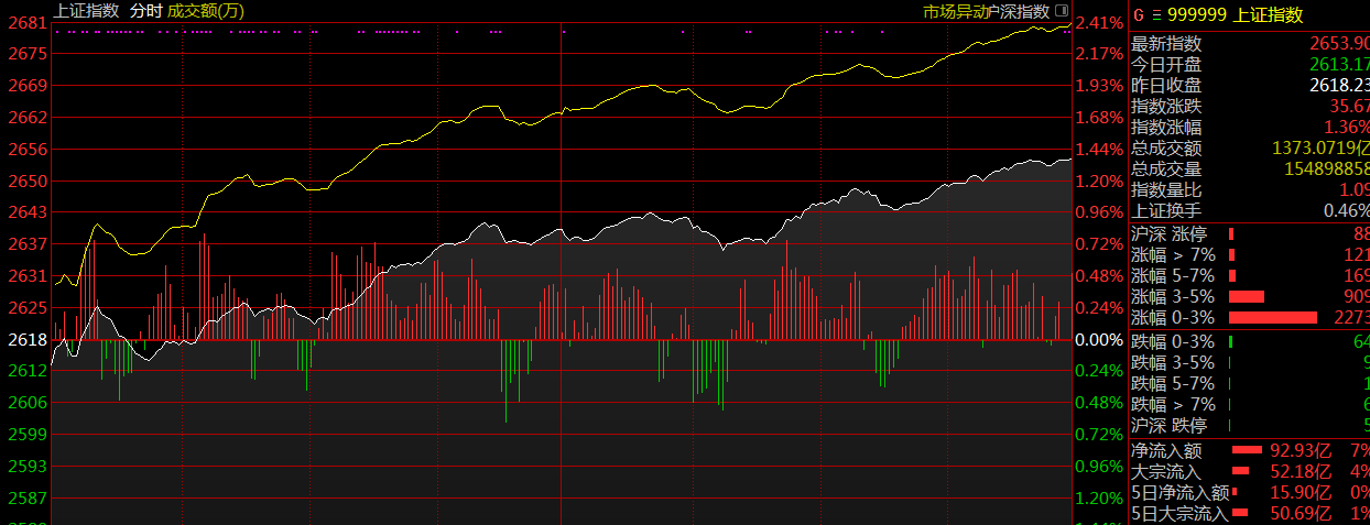 兩市今日平開(kāi),隨后氫燃料電池、券商板塊攻勢(shì)再起推動(dòng)指數(shù)沖高,早盤(pán)兩市震蕩走強(qiáng)。午后指數(shù)持續(xù)拉升,大消費(fèi)板塊崛起,白酒板塊受資金追捧領(lǐng)漲市場(chǎng),市場(chǎng)人氣比較活躍。