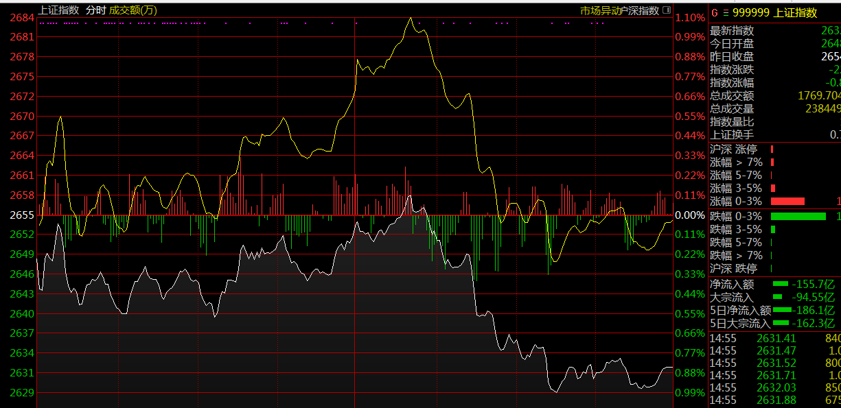 兩市早盤窄幅震蕩,受恒立實(shí)業(yè)(000622)[AI決策]跳水影響,高位強(qiáng)勢股集體走弱。午后指數(shù)回暖一度沖高隨后快速跳水,北上資金轉(zhuǎn)為凈流出,白酒券商石油等權(quán)重板塊拖累滬指,市場賺錢效應(yīng)有所降低。