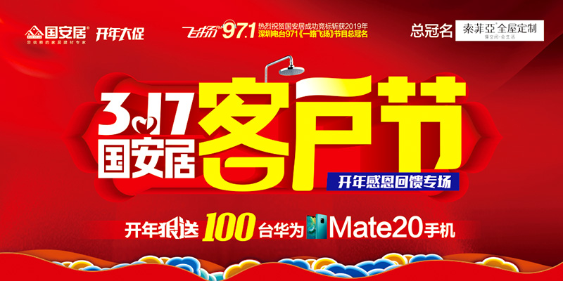國安居一直心懷感恩,感謝十多年來累計30萬老客戶的信賴與支持,此次活動不僅是為了品牌優(yōu)惠,更多的是給老客戶送去關(guān)懷和福利。國安居特聯(lián)合深圳電臺971王牌節(jié)目一路飛揚鼎力巨獻(xiàn),聯(lián)手旗下百位工廠總裁打造開年大促,推出多重優(yōu)惠:1、開年狠送100臺華為mate20手機;2、聯(lián)購滿額返100萬現(xiàn)金,上不封頂?shù)瘸祷仞伝顒?,?.15為契機來回饋多年來關(guān)注國安居、支持國安居的廣大消費者,以最大限度的優(yōu)惠、最為超值的實惠、最為驚喜的鉅惠獻(xiàn)禮3.17大促!