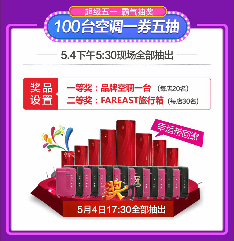 5、1元換購FAREAST旅行箱:活動期間,顧客凡在店內(nèi)下定實(shí)付(多個訂單可累積)滿5000元可加199元換購22寸 FAREAST旅行箱;滿10000元可加一元換購22寸 FAREAST旅行箱,滿20000元加一元換購27寸FAREAST旅行箱,送完即止。