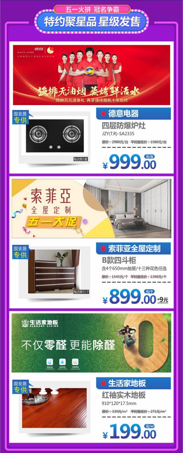 4、冠名聚星品爆款星級發(fā)售:4月20日-5月4日活動期間,國安居精選三大家居大牌火拼五一,星級巨獻(xiàn)!999元搶德意電器爐灶、899元搶索菲亞全屋定制四斗柜、199元搶生活家實(shí)木地板,限量爆款全城瘋搶,絕對驚爆眼球。