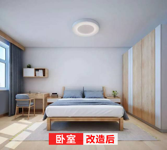 改造后的臥室開闊簡(jiǎn)潔,藍(lán)灰色床品與窗簾,色調(diào)一致,一整排的衣柜完全可以滿足生活需求。