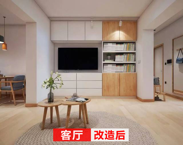 改造后的客廳同樣干凈簡(jiǎn)潔,打造一面電視柜做儲(chǔ)物,抽屜+儲(chǔ)物柜+書柜的設(shè)計(jì),能夠滿足客廳的收納需求。