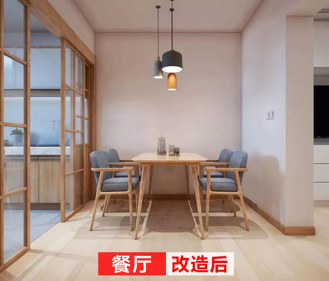 改造前的餐廳不僅僅是餐廳,還有一根晾衣繩,做晾衣區(qū);同樣餐廳也是很亂的,灰色的玻璃看起來(lái)很臟。