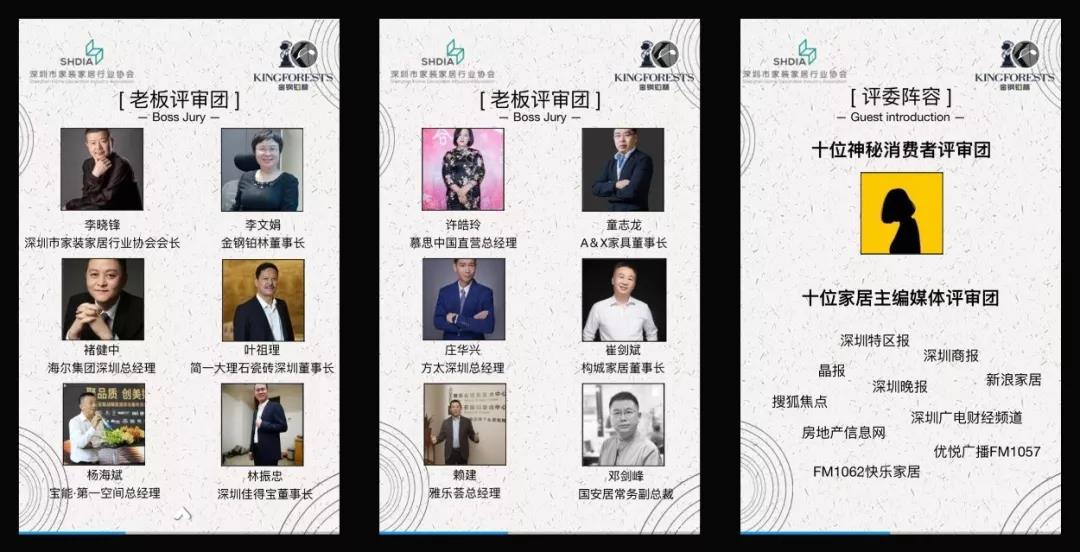 其中,由簡一大理石瓷磚、海爾卡薩帝、慕思寢具、A&X家具、方太電器、構(gòu)城定制、雅樂薈、寶能第一空間、國安居、佳得寶等家居行業(yè)知名品牌老總組成的老板評審團(tuán)特別引人注目。組委會特別介紹,這些品牌在行業(yè)的影響力有目共睹,他們的認(rèn)可是對設(shè)計能力與市場影響力不可置疑的肯定。