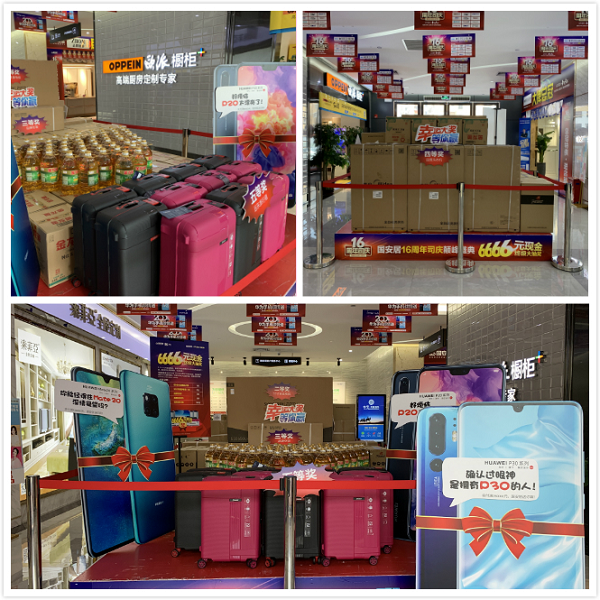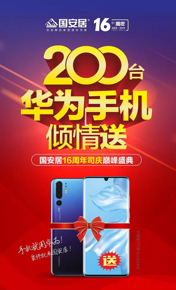 據(jù)了解,這場從6月14日持續(xù)至30日的司慶活動,國安居為業(yè)主朋友們準(zhǔn)備了六大鉅惠:1、司慶重磅獻(xiàn)豪禮,七店就送200臺華為手機(jī)!6.30當(dāng)天累計訂單(可多個品牌下定)實(shí)付滿15000元送遠(yuǎn)東旅行箱一個,實(shí)付滿80000元送華為P20一臺,實(shí)付滿150000元送華為mate20一臺,實(shí)付滿250000元送華為P30手機(jī)一臺;2、6月30日前,提前在國安居店面及微信16元搶購《司慶超抵卡》,活動當(dāng)天簽到即可尊享6重超值豪禮;3、6月14日-6月29日活動期間,顧客買單后微信分享活動,即可領(lǐng)取16-666元隨機(jī)金額現(xiàn)金紅包一個,5000個現(xiàn)金紅包等您來瓜分!還有機(jī)會贏取終極大獎華為P30哦;4、國安居16周年司慶公益義賣,驚現(xiàn)160元馬桶、160元爐灶、16元花灑、16元鞋柜……買到就是賺到!沒錯,就是這么任性;5、160萬現(xiàn)金聯(lián)單就返,6月30日活動當(dāng)天,在國安居下定3個品牌以上(每個品牌實(shí)付滿3000元),即可參與聯(lián)單返現(xiàn)活動,多買多返,上不封頂;6、終極抽6666元現(xiàn)金大獎,6.15-6.30活動期間,購物實(shí)付金額滿2000元可領(lǐng)取抽獎券一張,滿4000元領(lǐng)取兩張,以此類推。