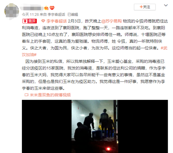 這批物資中,安排消毒液的網(wǎng)友是李宇春的粉絲,他們當晚就將令狐師傅日夜兼程的故事發(fā)布到了社交平臺。