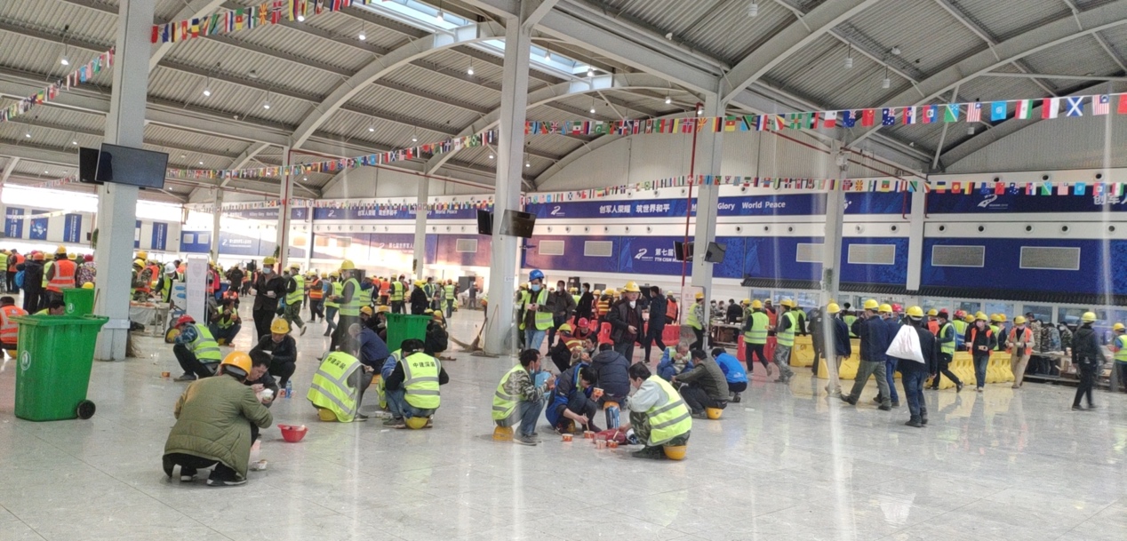 中午就餐時,提醒大家“分開就餐,對疫情時刻保持警惕”的廣播聲不絕于耳。偌大的空地上,不少工人都謹慎地與同事們分開適當(dāng)距離,蹲在地上開始快速用餐。同樣也包括楊杰,“吃飯要保持距離。我們快點吃完,就能快點回去繼續(xù)干?!?/p>