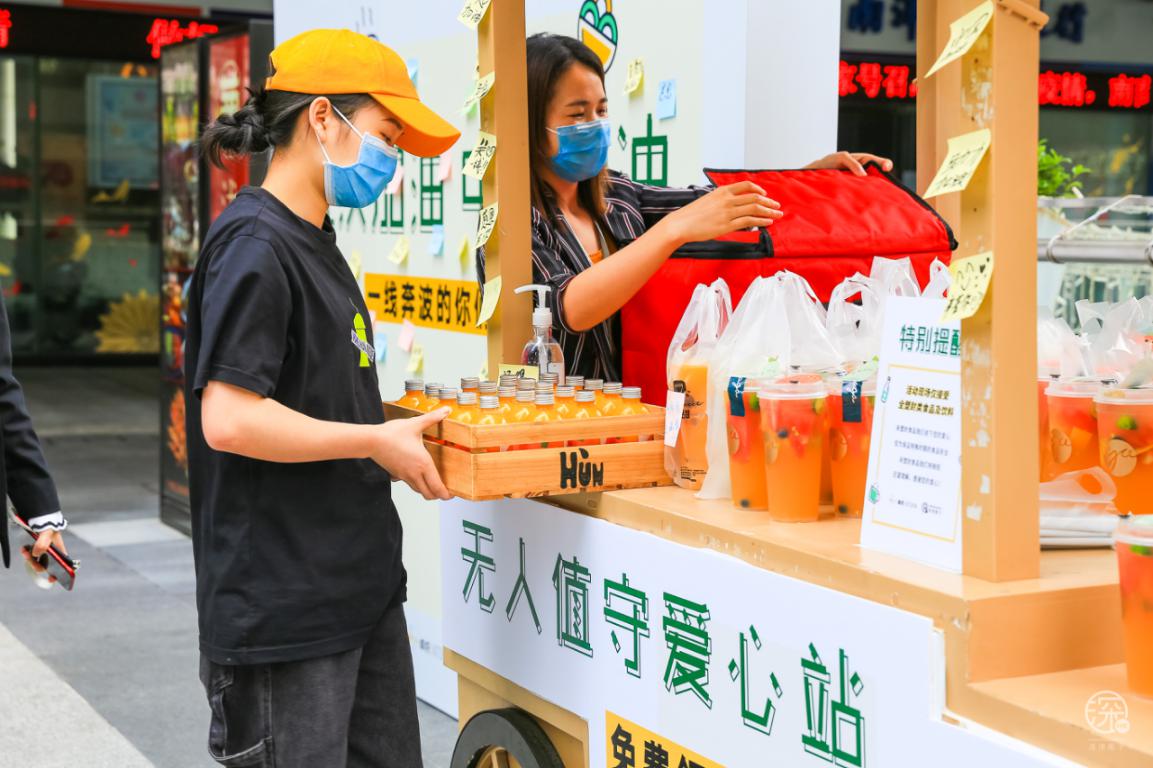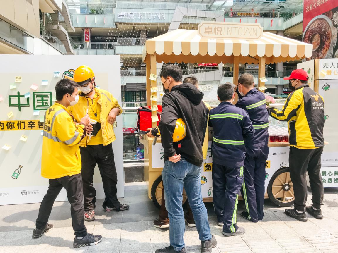 3月3日至3月8日卓悅INTOWN在街頭專設(shè)了一個”無人值守愛心站”,用愛心餐車上放滿了食物冷/熱飲,專門免費贈送給快遞、外賣小哥、環(huán)衛(wèi)工人、警察、城管等一線奔波的人員。