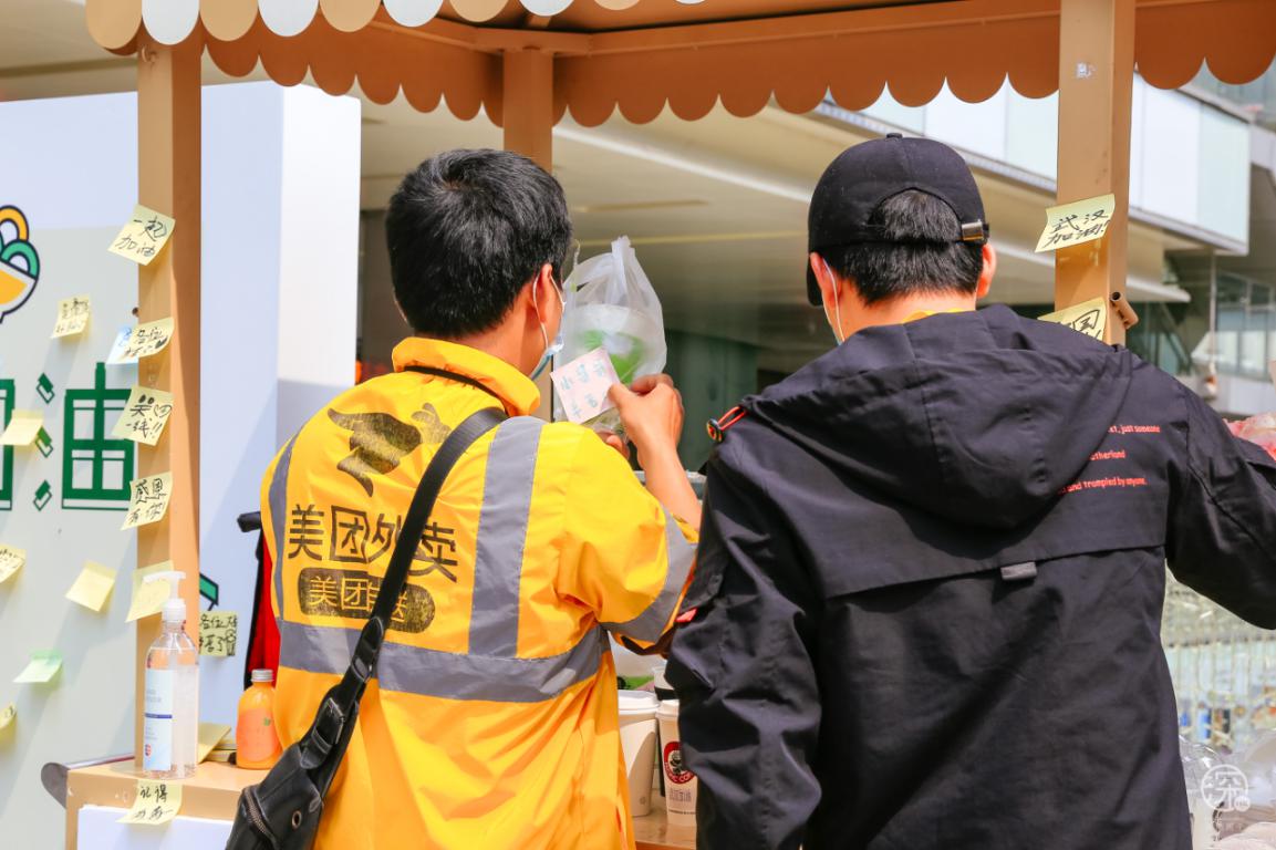 中午送餐高峰期結(jié)束后,周邊上班的愛心市民得知這個活動后,也不斷來悄悄“補貨”。有的在便利店打包了烏冬面放在愛心餐車上;有的遠程購買了薯條、水果茶并留下了貼心備注;還有的市民陸續(xù)帶著“奇奇怪怪”的物品放在無人值守愛心站,在這里感受到了深圳這座城市的溫暖。