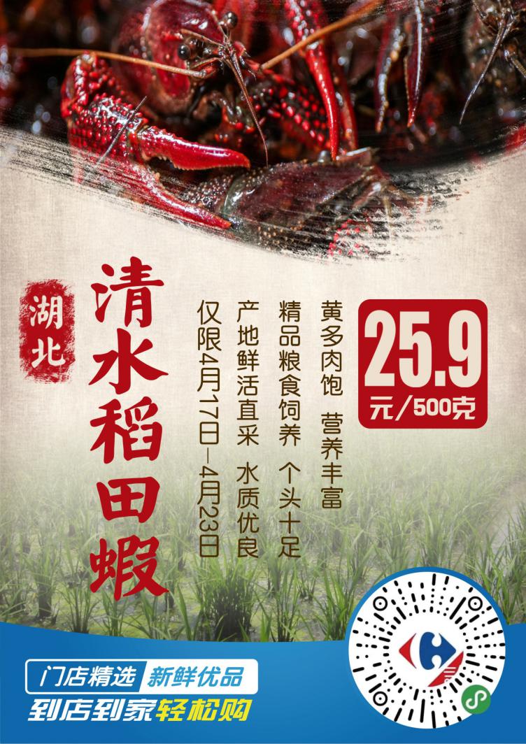 15號開始捕撈的這批湖北“清水稻田蝦”將于16號完成分揀裝車,發(fā)往家樂福全國各地大倉,17號,家樂福位于北京,上海、哈爾濱,長沙,成都,昆明,廣州,深圳等地的155家門店鮮活開售,恰逢家樂福418購物節(jié),嘗鮮價低到25.9元/500克(僅限4月17日至23日)。同時,顧客還可以通過家樂福小程序、蘇寧易購app、蘇寧小店App、及美團(tuán)、餓了么下單,享受1小時送到家的極致“鮮“體驗。