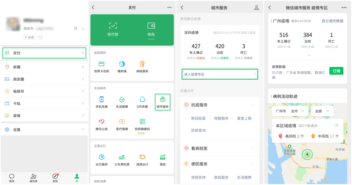 讀特客戶端·深圳新聞網(wǎng)2021年6月16日訊 (記者 田志強(qiáng))端午期間,為減少疫情傳播風(fēng)險(xiǎn),廣東市民紛紛響應(yīng)號(hào)召實(shí)行就地過(guò)節(jié),落實(shí)非必要不出省的相關(guān)要求。為進(jìn)一步助力廣東及全國(guó)人民抗疫,為市民提供準(zhǔn)確疫情資訊及抗疫服務(wù),近日,微信更新城市服務(wù)疫情專區(qū),支持查看疫情數(shù)據(jù)、病例活動(dòng)軌跡、疫情資訊以及接入抗疫服務(wù)。全國(guó)用戶打開(kāi)“我-支付-城市服務(wù)-疫情專區(qū)”,即可快速觸達(dá)各類(lèi)疫情相關(guān)服務(wù)。