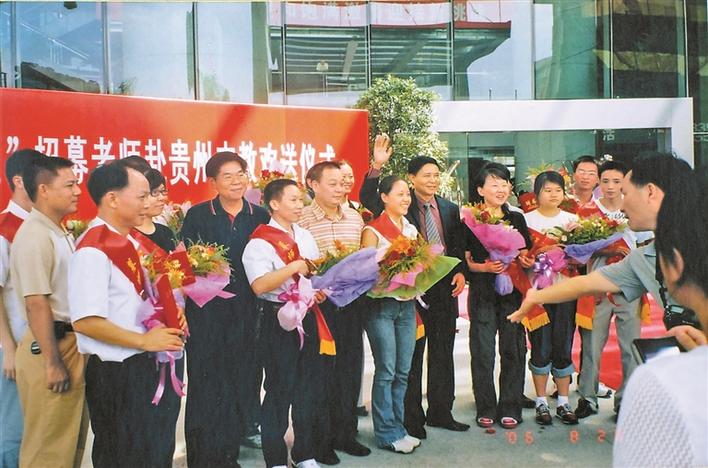 2006年,許凌峰(中間揮手者)歡送17名老師赴貴州支教。