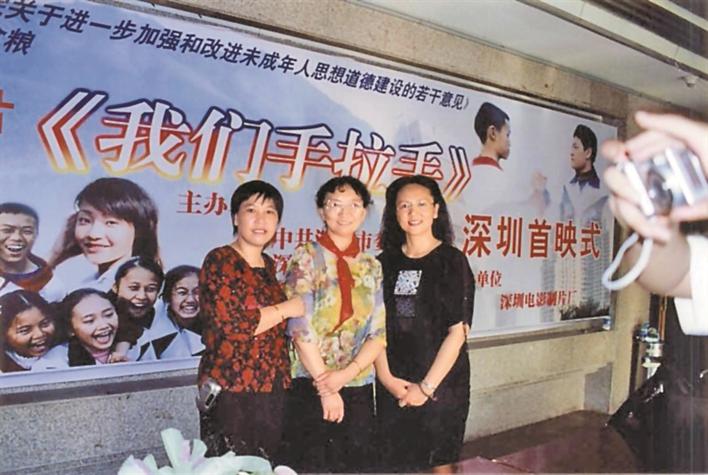 ▲2004年5月末,蘇曼華(中)和導(dǎo)演酈虹(右)在電影《我們手拉手》首映式上合影。