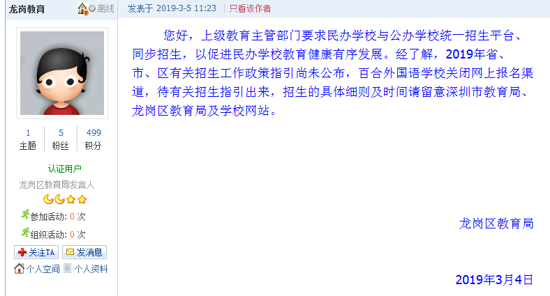 3月5日11時23分,龍崗區(qū)教育局官方賬號發(fā)布回應(yīng)網(wǎng)帖,回應(yīng)稱“上級教育主管部門要求民辦學(xué)校與公辦學(xué)校統(tǒng)一招生平臺、同步招生,以促進民辦學(xué)校教育健康有序發(fā)展。”“2019年省、市、區(qū)有關(guān)招生工作政策指引尚未公布,百合外國語學(xué)校關(guān)閉網(wǎng)上報名渠道,待有關(guān)招生指引出來,招生的具體細則及時間請留意深圳市教育局、龍崗區(qū)教育局及學(xué)校網(wǎng)站。”