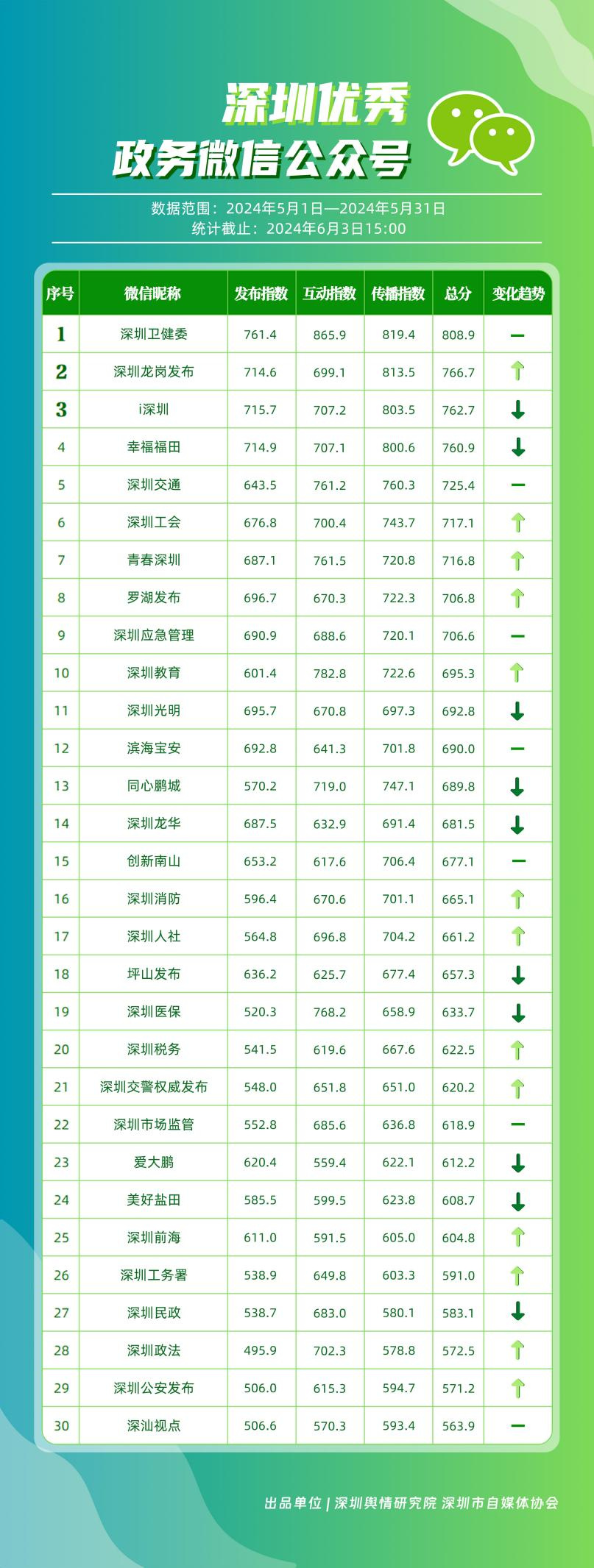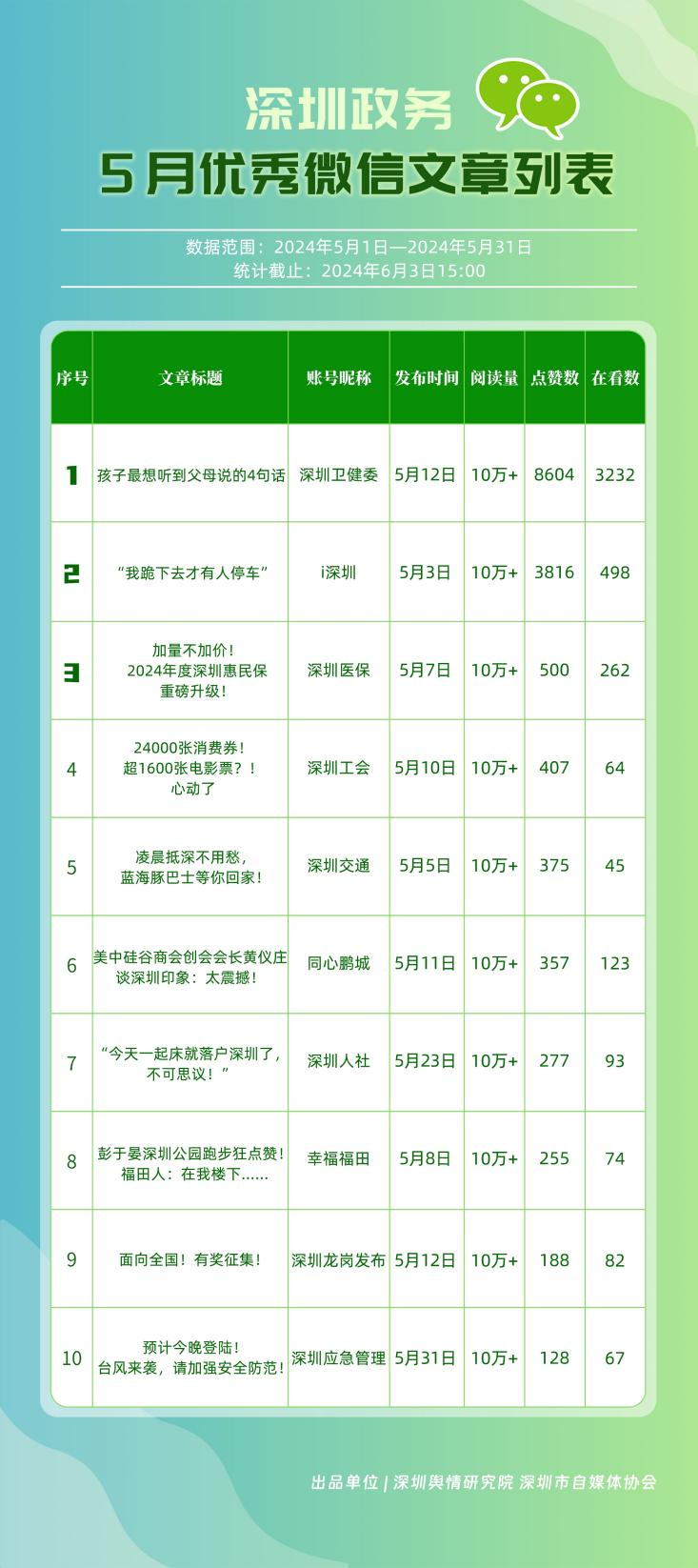 5月,“深圳衛(wèi)健委”“深圳龍崗發(fā)布”“i深圳”“幸福福田”“深圳交通”“深圳工會(huì)”“青春深圳”“羅湖發(fā)布”“深圳應(yīng)急管理”“深圳教育”等30個(gè)政務(wù)微信公眾號(hào),被評(píng)為“深圳優(yōu)秀政務(wù)微信公眾號(hào)”。5月,“深圳衛(wèi)健委”憑借精心創(chuàng)作的內(nèi)容、與受眾深入互動(dòng),多篇作品深受好評(píng),榮登榜單首位?!吧钲邶垗彴l(fā)布”“i深圳”“幸福福田”“深圳交通”等上榜公眾號(hào)也積極捕捉觀眾優(yōu)質(zhì)作品需求,把握主流熱點(diǎn)趨勢(shì),集中發(fā)揮政務(wù)媒體傳播力量,在本期也取得了較為亮眼的成績(jī),進(jìn)一步推動(dòng)了政務(wù)信息傳播工作提質(zhì)增效。