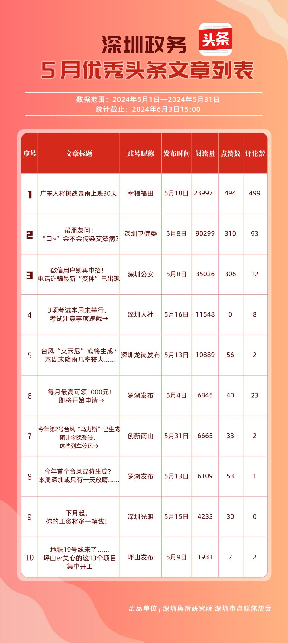 5月,“幸福福田”“深圳龍崗發(fā)布”“深圳衛(wèi)健委”“深圳龍華”“深圳公安”“創(chuàng)新南山”“深圳光明”“羅湖發(fā)布”“深圳人社”“坪山發(fā)布”共10個(gè)政務(wù)頭條號(hào)能夠及時(shí)發(fā)布政務(wù)信息及公共服務(wù)信息,服務(wù)經(jīng)濟(jì)社會(huì)發(fā)展,滿足公眾信息需求,位列“優(yōu)秀政務(wù)頭條號(hào)”榜單,《廣東人將挑戰(zhàn)暴雨上班30天》《幫朋友問:“口~”會(huì)不會(huì)傳染艾滋???》等優(yōu)秀文章資訊深入人心。其他未上榜單位應(yīng)積極運(yùn)用該新媒體平臺(tái)助力政務(wù)公開,讓權(quán)威聲音有效傳播到目標(biāo)受眾,更好地服務(wù)人民群眾。
