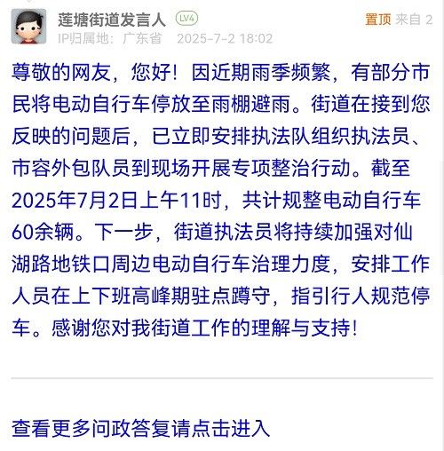 尊敬的網(wǎng)友,您好!因近期雨季頻繁,有部分市民將電動自行車停放至雨棚避雨。街道在接到您反映的問題后,已立即安排執(zhí)法隊組織執(zhí)法員、市容外包隊員到現(xiàn)場開展專項整治行動。截至2025年7月2日上午11時,共計規(guī)整電動自行車60余輛。下一步,街道執(zhí)法員將持續(xù)加強對仙湖路地鐵口周邊電動自行車治理力度,安排工作人員在上下班高峰期駐點蹲守,指引行人規(guī)范停車。感謝您對我街道工作的理解與支持!