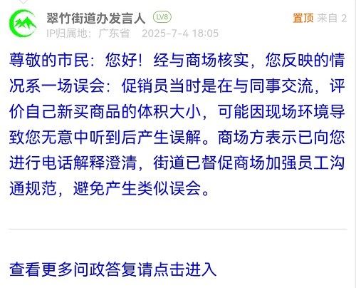 尊敬的市民:您好!經(jīng)與商場核實,您反映的情況系一場誤會:促銷員當(dāng)時是在與同事交流,評價自己新買商品的體積大小,可能因現(xiàn)場環(huán)境導(dǎo)致您無意中聽到后產(chǎn)生誤解。商場方表示已向您進行電話解釋澄清,街道已督促商場加強員工溝通規(guī)范,避免產(chǎn)生類似誤會。