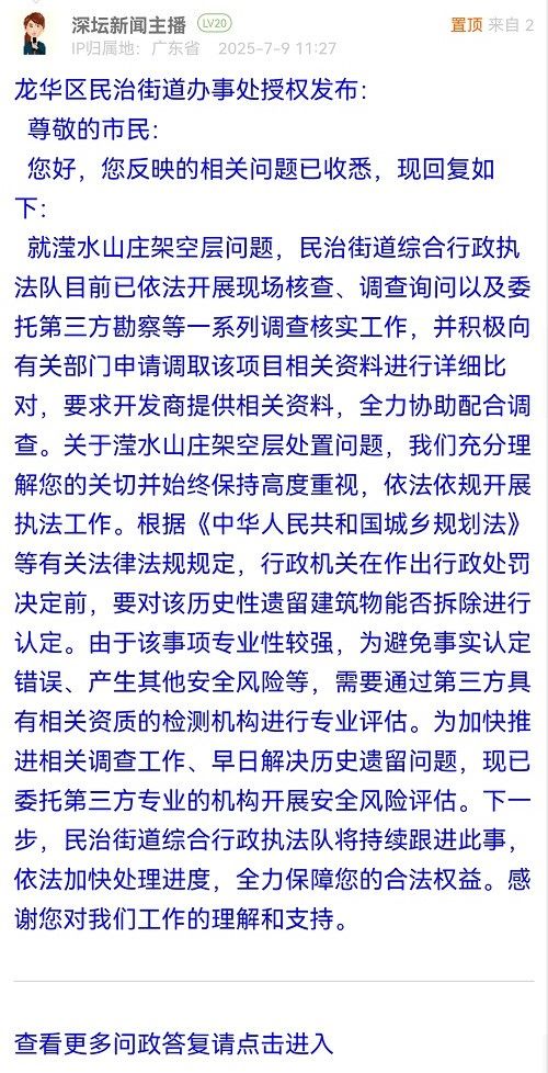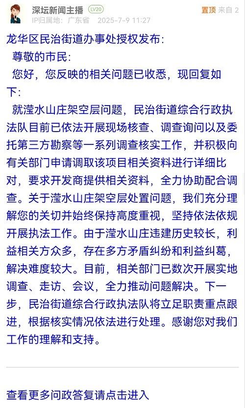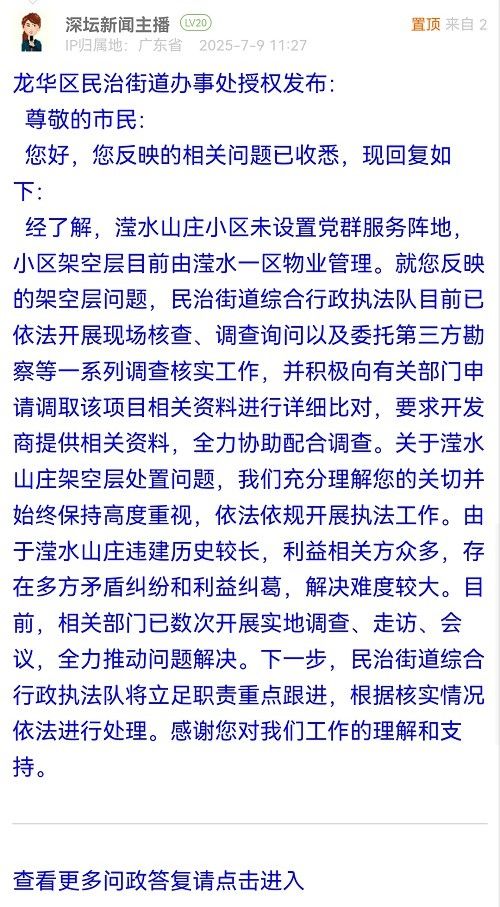 就瀅水山莊架空層問題,民治街道綜合行政執(zhí)法隊目前已依法開展現(xiàn)場核查、調(diào)查詢問以及委托第三方勘察等一系列調(diào)查核實工作,并積極向有關(guān)部門申請調(diào)取該項目相關(guān)資料進行詳細(xì)比對,要求開發(fā)商提供相關(guān)資料,全力協(xié)助配合調(diào)查。關(guān)于瀅水山莊架空層處置問題,我們充分理解您的關(guān)切并始終保持高度重視,堅持依法依規(guī)開展執(zhí)法工作。由于瀅水山莊違建歷史較長,利益相關(guān)方眾多,存在多方矛盾糾紛和利益糾葛,解決難度較大。目前,相關(guān)部門已數(shù)次開展實地調(diào)查、走訪、會議,全力推動問題解決。下一步,民治街道綜合行政執(zhí)法隊將立足職責(zé)重點跟進,根據(jù)核實情況依法進行處理。感謝您對我們工作的理解和支持。