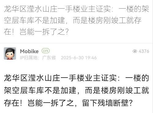 14. 帖文《龍華區(qū)瀅水山莊一手樓業(yè)主證實:一樓的架空層車庫不是加建,而是樓房剛竣工就存在!豈能一拆了之?》