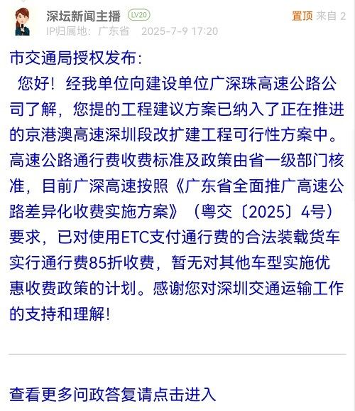 您好!經(jīng)我單位向建設(shè)單位廣深珠高速公路公司了解,您提的工程建議方案已納入了正在推進的京港澳高速深圳段改擴建工程可行性方案中。高速公路通行費收費標(biāo)準(zhǔn)及政策由省一級部門核準(zhǔn),目前廣深高速按照《廣東省全面推廣高速公路差異化收費實施方案》(粵交〔2025〕4號)要求,已對使用ETC支付通行費的合法裝載貨車實行通行費85折收費,暫無對其他車型實施優(yōu)惠收費政策的計劃。感謝您對深圳交通運輸工作的支持和理解!