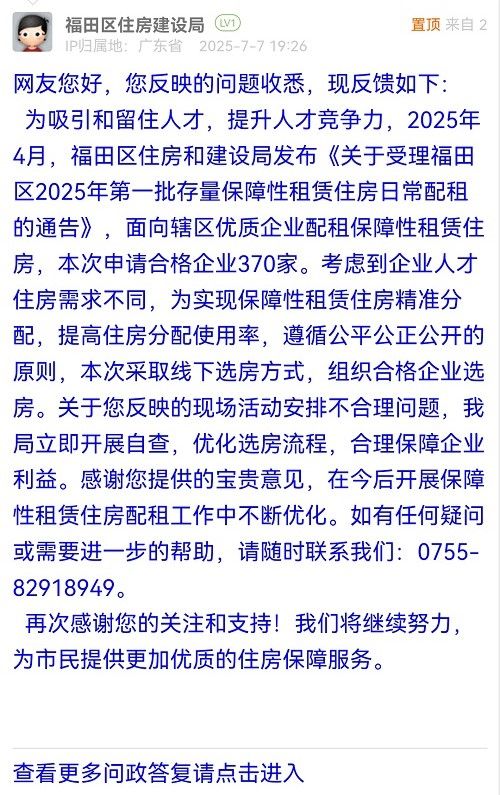 為吸引和留住人才,提升人才競爭力,2025年4月,福田區(qū)住房和建設(shè)局發(fā)布《關(guān)于受理福田區(qū)2025年第一批存量保障性租賃住房日常配租的通告》,面向轄區(qū)優(yōu)質(zhì)企業(yè)配租保障性租賃住房,本次申請合格企業(yè)370家。考慮到企業(yè)人才住房需求不同,為實現(xiàn)保障性租賃住房精準(zhǔn)分配,提高住房分配使用率,遵循公平公正公開的原則,本次采取線下選房方式,組織合格企業(yè)選房。關(guān)于您反映的現(xiàn)場活動安排不合理問題,我局立即開展自查,優(yōu)化選房流程,合理保障企業(yè)利益。感謝您提供的寶貴意見,在今后開展保障性租賃住房配租工作中不斷優(yōu)化。如有任何疑問或需要進一步的幫助,請隨時聯(lián)系我們:0755-82918949。