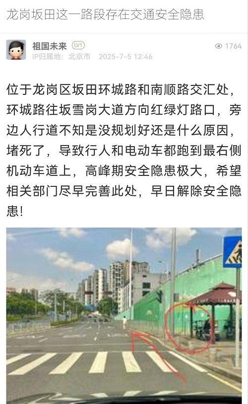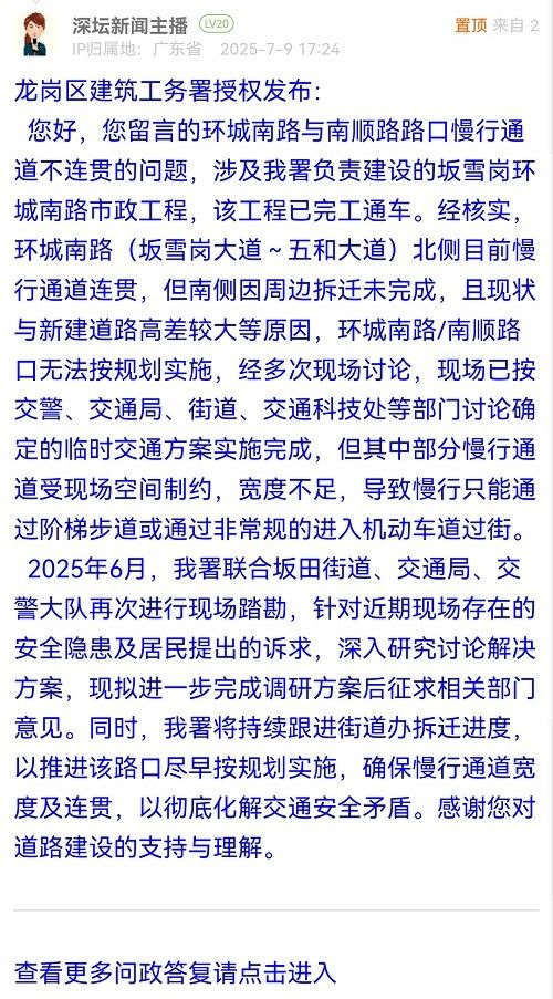 2025年6月,我署聯(lián)合坂田街道、交通局、交警大隊再次進行現(xiàn)場踏勘,針對近期現(xiàn)場存在的安全隱患及居民提出的訴求,深入研究討論解決方案,現(xiàn)擬進一步完成調(diào)研方案后征求相關(guān)部門意見。同時,我署將持續(xù)跟進街道辦拆遷進度,以推進該路口盡早按規(guī)劃實施,確保慢行通道寬度及連貫,以徹底化解交通安全矛盾。感謝您對道路建設(shè)的支持與理解。