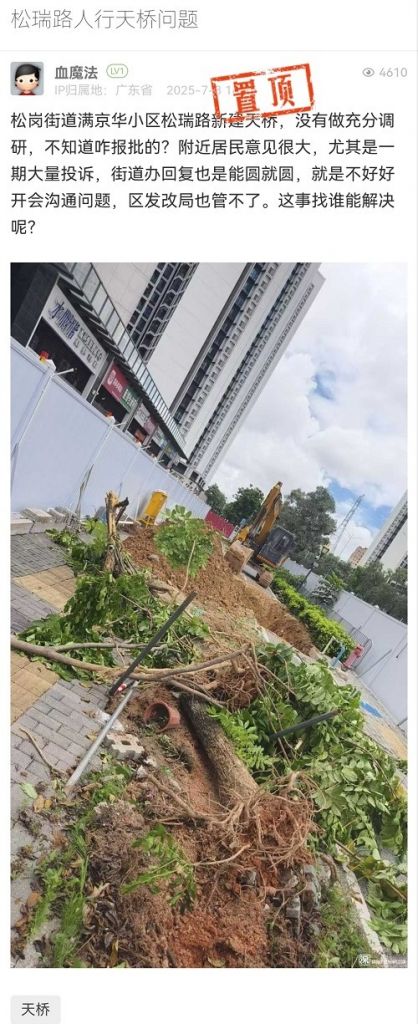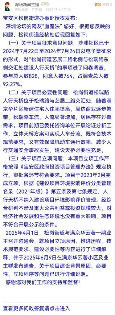 2025年4月1日,松崗街道與滿京華云著一期業(yè)主召開溝通會,就項目立項原因、推進歷程、技術(shù)規(guī)范要求、建設(shè)必要性等內(nèi)容進行了詳細(xì)解釋,并于2025年6月9日在滿京華云著小區(qū)及業(yè)主群發(fā)布通告,關(guān)于項目建設(shè)背景原因、必要性、立項程序等問題已進行詳細(xì)說明。