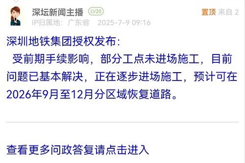 受前期手續(xù)影響,部分工點未進場施工,目前問題已基本解決,正在逐步進場施工,預(yù)計可在2026年9月至12月分區(qū)域恢復(fù)道路。