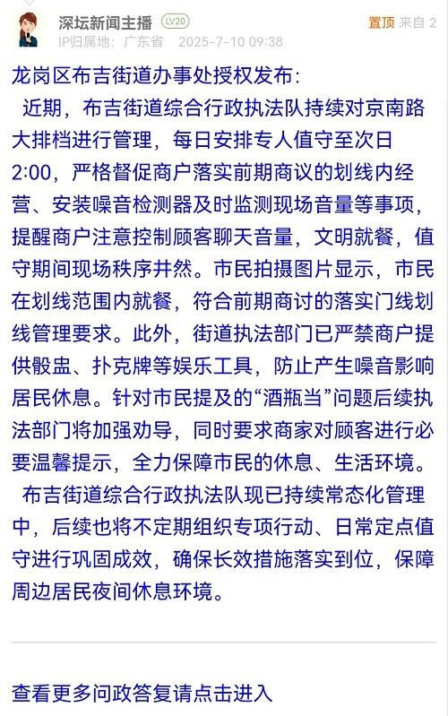 布吉街道綜合行政執(zhí)法隊現(xiàn)已持續(xù)常態(tài)化管理中,后續(xù)也將不定期組織專項行動、日常定點值守進行鞏固成效,確保長效措施落實到位,保障周邊居民夜間休息環(huán)境。