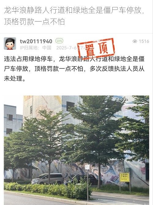 17. 帖文《龍華浪靜路人行道和綠地全是僵尸車停放,頂格罰款一點不怕》