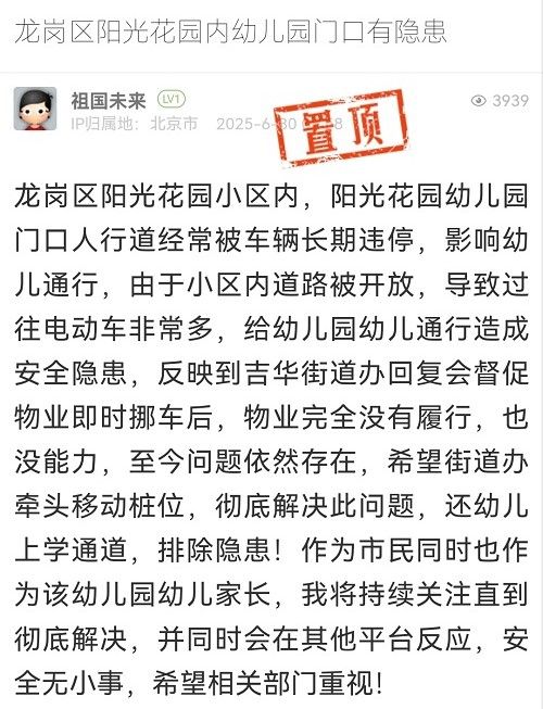 12. 帖文《龍崗區(qū)陽光花園內(nèi)幼兒園門口有隱患》