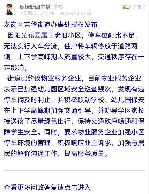 街道已約談物業(yè)服務(wù)企業(yè),目前物業(yè)服務(wù)企業(yè)表示已加強幼兒園區(qū)域安全巡查頻次,發(fā)現(xiàn)有違停車輛及時制止,并積極聯(lián)動學(xué)校、幼兒園保安在上下學(xué)高峰期加強交通引導(dǎo),并勸導(dǎo)學(xué)區(qū)家長接送孩子盡量綠色出行,保持交通秩序暢通和保障學(xué)生安全。同時,要求物業(yè)服務(wù)企業(yè)加強小區(qū)停車環(huán)境的管理,積極響應(yīng)業(yè)主訴求,加強與居民的解釋溝通工作,提高服務(wù)質(zhì)量。