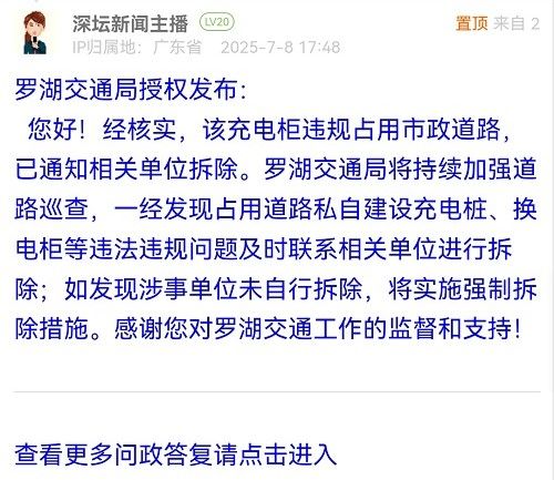 您好!經(jīng)核實,該充電柜違規(guī)占用市政道路,已通知相關(guān)單位拆除。羅湖交通局將持續(xù)加強道路巡查,一經(jīng)發(fā)現(xiàn)占用道路私自建設(shè)充電樁、換電柜等違法違規(guī)問題及時聯(lián)系相關(guān)單位進行拆除;如發(fā)現(xiàn)涉事單位未自行拆除,將實施強制拆除措施。感謝您對羅湖交通工作的監(jiān)督和支持!