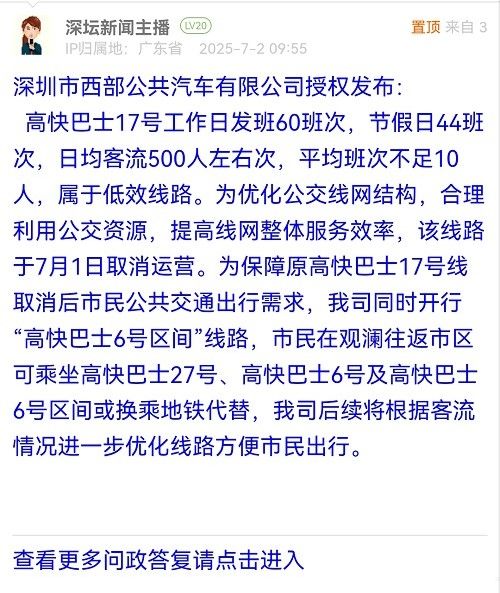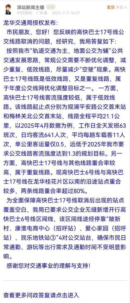 高快巴士17號工作日發(fā)班60班次,節(jié)假日44班次,日均客流500人左右次,平均班次不足10人,屬于低效線路。為優(yōu)化公交線網(wǎng)結(jié)構(gòu),合理利用公交資源,提高線網(wǎng)整體服務(wù)效率,該線路于7月1日取消運營。為保障原高快巴士17號線取消后市民公共交通出行需求,我司同時開行“高快巴士6號區(qū)間”線路,市民在觀瀾往返市區(qū)可乘坐高快巴士27號、高快巴士6號及高快巴士6號區(qū)間或換乘地鐵代替,我司后續(xù)將根據(jù)客流情況進一步優(yōu)化線路方便市民出行。