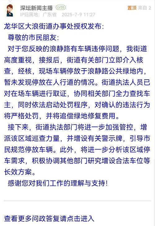 對于您反映的浪靜路有車輛違停問題,我街道高度重視,接報后,街道有關(guān)部門立即介入核查,經(jīng)核,現(xiàn)場車輛停放于浪靜路公共綠地內(nèi),暫未發(fā)現(xiàn)停放在人行道的情況。街道執(zhí)法人員已對在場車輛進行取證,協(xié)同相關(guān)部門全力查找車主,同時依法啟動處罰程序,對確認(rèn)的違法行為將嚴(yán)格處罰,并將追償綠地修復(fù)費用。