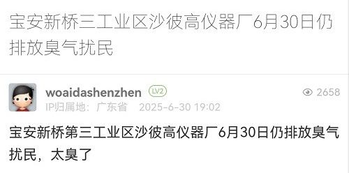2. 帖文《寶安新橋三工業(yè)區(qū)沙彼高儀器廠6月30日仍排放臭氣擾民》《寶安區(qū)新橋第三工業(yè)區(qū)沙彼高儀器廠7月1日排放臭氣》