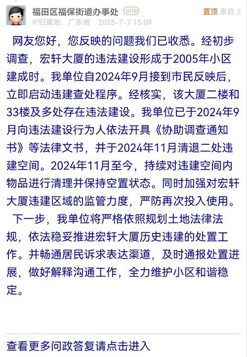 網(wǎng)友您好,您反映的問題我們已收悉。經(jīng)初步調(diào)查,宏軒大廈的違法建設(shè)形成于2005年小區(qū)建成時。我單位自2024年9月接到市民反映后,立即啟動違建查處程序。經(jīng)核實,該大廈二樓和33樓及多處存在違法建設(shè)。我單位已于2024年9月向違法建設(shè)行為人依法開具《協(xié)助調(diào)查通知書》等法律文書,并于2024年11月清退二處違建空間。2024年11月至今,持續(xù)對違建空間內(nèi)物品進行清理并保持空置狀態(tài)。同時加強對宏軒大廈違建區(qū)域的監(jiān)管力度,嚴(yán)防再次投入使用。