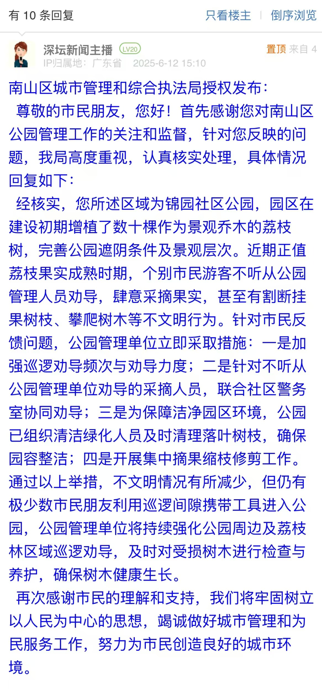有市民反映南山區(qū)部分公園內(nèi)的荔枝樹(shù)被隨意采摘