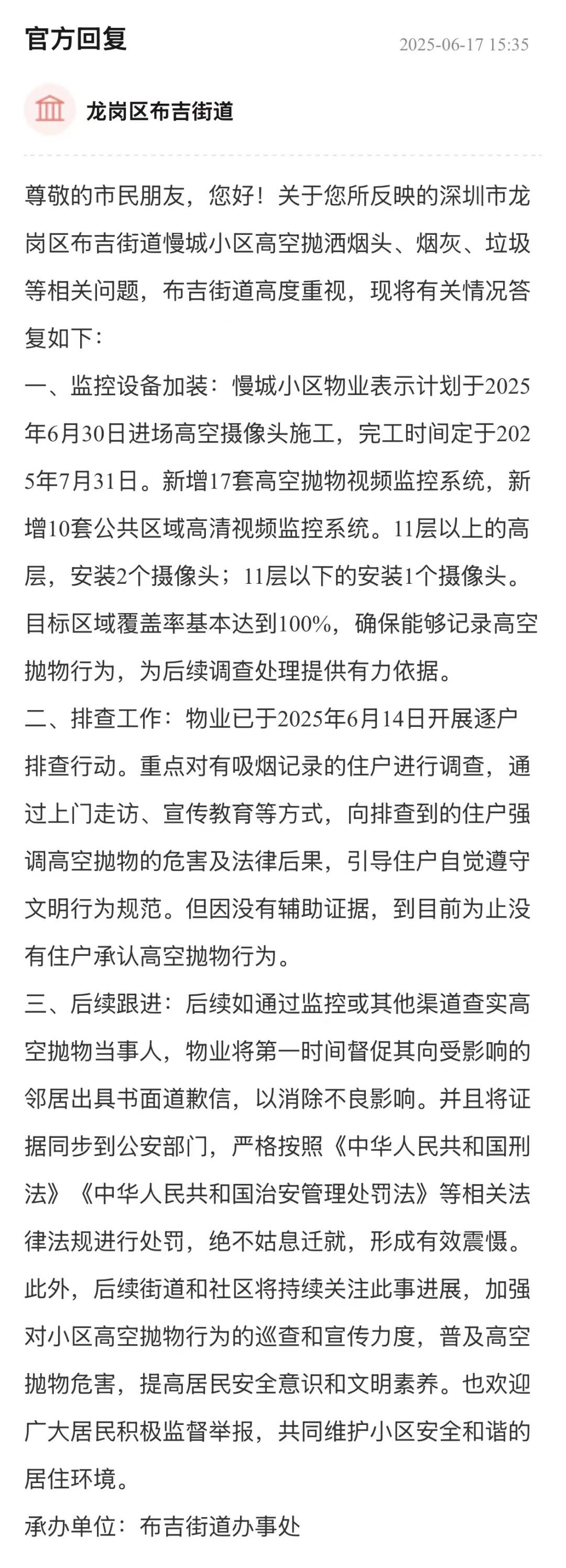 高空拋物嚴(yán)重威脅居民人身與財(cái)產(chǎn)安全,需嚴(yán)肅對(duì)待。街道辦接到相關(guān)反映后,積極推動(dòng)物業(yè)規(guī)劃加裝視頻監(jiān)控系統(tǒng),明確了施工和完工時(shí)間,同時(shí)安排物業(yè)開(kāi)展逐戶(hù)排查,重點(diǎn)調(diào)查有吸煙記錄住戶(hù),體現(xiàn)出對(duì)問(wèn)題的重視和解決問(wèn)題的行動(dòng)力。在后續(xù)保障方面,明確查實(shí)拋物當(dāng)事人后將督促其道歉并交由公安部門(mén)依規(guī)處罰,街道和社區(qū)也將持續(xù)關(guān)注、加強(qiáng)巡查與宣傳,為維護(hù)小區(qū)安全提供了有力支持。