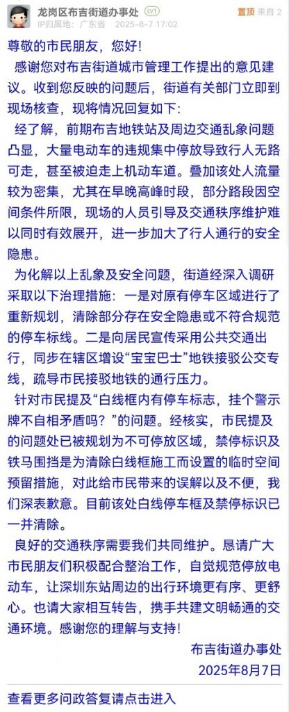 經(jīng)了解,前期布吉地鐵站及周邊交通亂象問題凸顯,大量電動車的違規(guī)集中停放導(dǎo)致行人無路可走,甚至被迫走上機(jī)動車道。疊加該處人流量較為密集,尤其在早晚高峰時段,部分路段因空間條件所限,現(xiàn)場的人員引導(dǎo)及交通秩序維護(hù)難以同時有效展開,進(jìn)一步加大了行人通行的安全隱患。