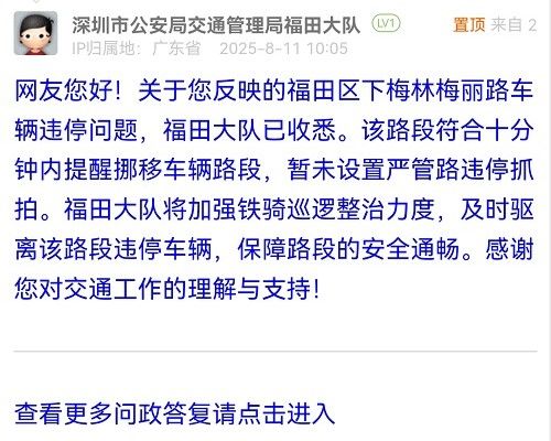 網(wǎng)友您好!關(guān)于您反映的福田區(qū)下梅林梅麗路車輛違停問題,福田大隊(duì)已收悉。該路段符合十分鐘內(nèi)提醒挪移車輛路段,暫未設(shè)置嚴(yán)管路違停抓拍。福田大隊(duì)將加強(qiáng)鐵騎巡邏整治力度,及時驅(qū)離該路段違停車輛,保障路段的安全通暢。感謝您對交通工作的理解與支持!