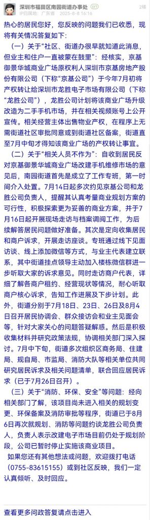 (二)關(guān)于“相關(guān)人員不作為”:自收到居民反對京基御景華城商業(yè)廣場改建手機(jī)維修市場的意見后,南園街道首先是成立了工作專班,第一時間介入處置。7月14日起多次約見京基公司和龍勝公司負(fù)責(zé)人,提醒其認(rèn)真考量商業(yè)規(guī)劃方案的可行性,積極探索更為妥善的商業(yè)方案,并于7月16日起開展現(xiàn)場走訪與檔案調(diào)閱工作,為后續(xù)解答居民問題做好準(zhǔn)備。其次是定向收集居民和商戶訴求,開展走訪座談。專班通過線下見面訪談、線上添加微信等方式,與業(yè)主代表建立聯(lián)系,其中街道掛點(diǎn)領(lǐng)導(dǎo)主動加入樓棟微信群進(jìn)一步聽取大家的訴求意見。同時走訪商戶代表,詳細(xì)了解各商戶租約、經(jīng)營現(xiàn)狀等情況,耐心聽取商戶核心訴求,告知工作進(jìn)展及下步計(jì)劃。此外,街道分別于7月18日、23日、26日及8月4日召開居民協(xié)調(diào)會、群眾接訪會和業(yè)主見面會等,針對大家關(guān)心的問題答疑解惑。然后是積極收集材料并研究政策法規(guī),協(xié)調(diào)相關(guān)部門深入探討。7月中下旬,街道多次組織區(qū)商務(wù)局、住建局、規(guī)自局、市監(jiān)局、消防大隊(duì)等相關(guān)單位共同研究居民訴求及相關(guān)問題清單,聯(lián)合回應(yīng)居民訴求(已于7月26日召開)。