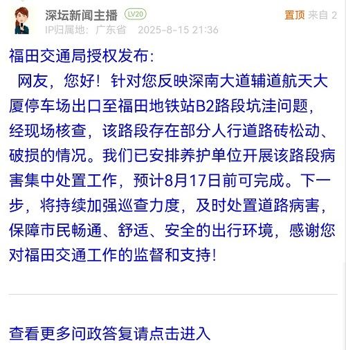 網(wǎng)友,您好!針對(duì)您反映深南大道輔道航天大廈停車(chē)場(chǎng)出口至福田地鐵站B2路段坑洼問(wèn)題,經(jīng)現(xiàn)場(chǎng)核查,該路段存在部分人行道路磚松動(dòng)、破損的情況。我們已安排養(yǎng)護(hù)單位開(kāi)展該路段病害集中處置工作,預(yù)計(jì)8月17日前可完成。下一步,將持續(xù)加強(qiáng)巡查力度,及時(shí)處置道路病害,保障市民暢通、舒適、安全的出行環(huán)境,感謝您對(duì)福田交通工作的監(jiān)督和支持!