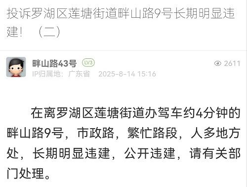 15. 帖文《投訴羅湖區(qū)蓮塘街道畔山路43號(hào)長(zhǎng)期明顯違建?。ㄆ撸?/a>》