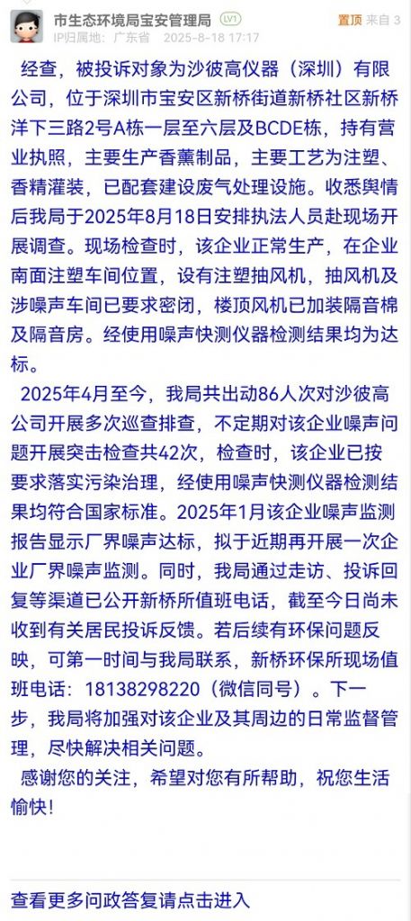 經(jīng)查,被投訴對(duì)象為沙彼高儀器(深圳)有限公司,位于深圳市寶安區(qū)新橋街道新橋社區(qū)新橋洋下三路2號(hào)A棟一層至六層及BCDE棟,持有營(yíng)業(yè)執(zhí)照,主要生產(chǎn)香薰制品,主要工藝為注塑、香精灌裝,已配套建設(shè)廢氣處理設(shè)施。收悉輿情后我局于2025年8月18日安排執(zhí)法人員赴現(xiàn)場(chǎng)開(kāi)展調(diào)查。現(xiàn)場(chǎng)檢查時(shí),該企業(yè)正常生產(chǎn),在企業(yè)南面注塑車(chē)間位置,設(shè)有注塑抽風(fēng)機(jī),抽風(fēng)機(jī)及涉噪聲車(chē)間已要求密閉,樓頂風(fēng)機(jī)已加裝隔音棉及隔音房。經(jīng)使用噪聲快測(cè)儀器檢測(cè)結(jié)果均為達(dá)標(biāo)。